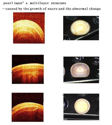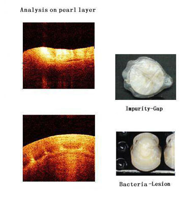 Applied range: OCT can be applied in quantitative grading of pearl and qualitative assessment of pearl quality. Conclusions are as follows: 1. Verify the authenticity and varieties of pearls, and distinguish whether pearls is clear; 2. Pearl grating based on nacre thickness measurement , thickness range 0.1~4mm and the error < 10%; 3. According to the pearl internal structure, it can provide supplementary information for pearl cultivation and quality assessment; 4. Without the color and variety restricted; 5. Pearl quality control and identification.